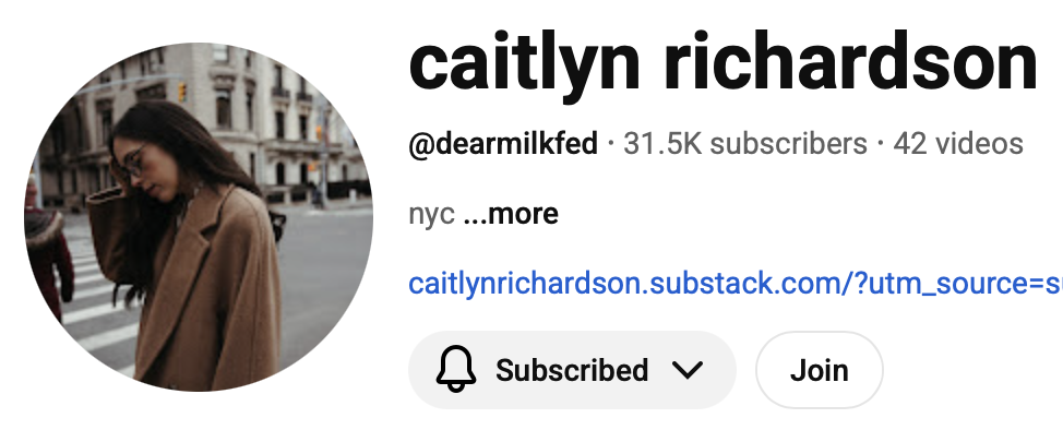 3. caitlyn richardson – Một youtuber mình vừa tìm đến gần đây sau khi xem video ngắn của chị trên tiktok nói về sự thân mật khi được thấu hiểu (the intimacy of being understood) bàn về cảm xúc gắn kết đặc biệt khi chúng ta không đơn thuần được nhìn thấy qua ánh mặt, được xây dựng hình ảnh qua góc nhìn của người tình, mà còn qua sự hiểu biết giữa hai cá thể có được do sự bồi đắp của thời gian, đó là bước ngoặc cho sự đồng điệu giữa hai tâm hồn. Video của chị Caitlyn thường xoay quanh những chủ đề triết học và luận xã hội thông qua những đúc kết từ những danh hào qua các quyển sách phi tiểu thuyết như Clarice Lispector, Simone de Beauvoir, Jean Paul Satre…