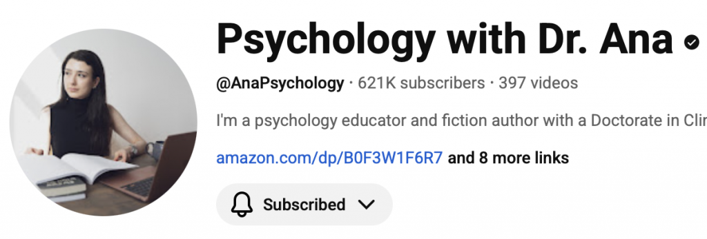 4. Psychology with Dr.Ana – Kênh youtube về tâm lý học với nhiều góc nhìn mang tính phản biện của tiến sĩ tâm lý học lâm sàng, chị Ana thường trích dẫn các bài báo khoa học, sách tâm lý học để biện luận về văn hoá đại chúng và những chuyển biến xã hội – chính trị rất gần gũi với thế hệ trẻ và những điều chúng ta đang đối mặt trong cuộc sống hằng ngày.