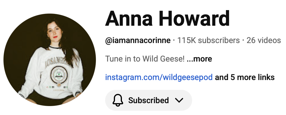 5. Anna Howard – Chị Anna có kênh podcast Wild Geese thường bàn luận về nữ giới, góc nhìn và vai trò của nữ giới trong truyền thông và văn hoá đại chúng. Đa phần nội dung bàn về những vấn đề tiêu điểm của thế hệ trong thời đại mạng xã hội như brain rot (não tàn?), tình yêu và đam mê, sự sáng tạo, làm sao để xây dựng nhân dạng trong một xã hội mỗi cá nhân đều ảnh hưởng và trở nên giống nhau dưới sự điều khiển của thuật toán và truyền thông.